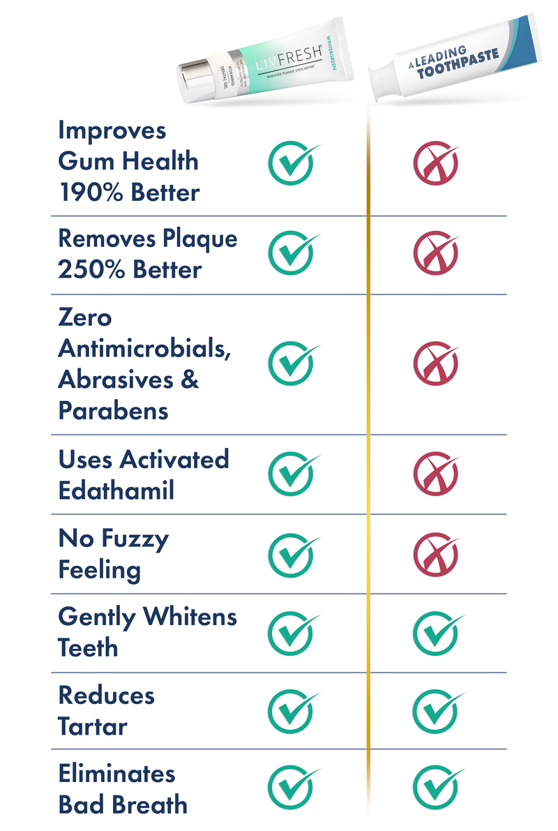 Clinical studies show LivFresh removes plaque 250% more effectively, reduces tartar buildup, eliminates morning breath, and cuts gum bleeding by 190% more than leading toothpaste brands. These results are supported by 26 peer-reviewed studies from top U.S. research institutions, over 40 patents, and even recognition from the U.S. Department of Defense.